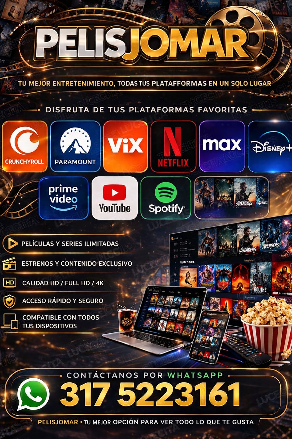 Con PelisJomar, tienes acceso a tus plataformas favoritas como Netflix, Disney+, Prime Video, YouTube, Spotify y muchas más, sin complicaciones. Todo reunido para que no tengas que estar pagando múltiples suscripciones por separado.